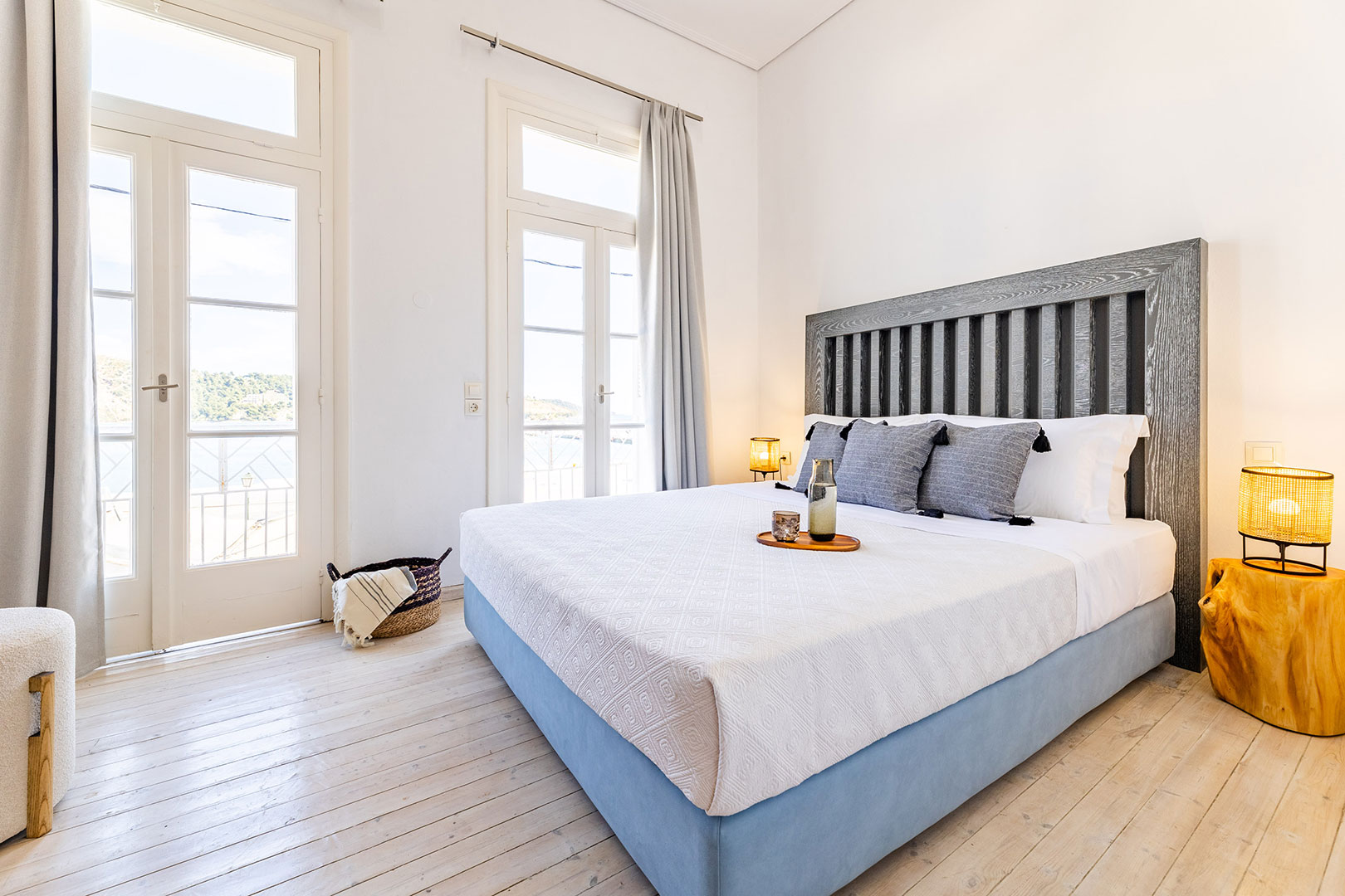 Λουσμένο στο απαλό φως της ημέρας και με θέα στη λαμπερή θάλασσα, αυτό το δωμάτιο αποτυπώνει το ήρεμο πνεύμα του νησιού. Καθαρές γραμμές, διακριτικά χρώματα και αέρινη ροή δημιουργούν ένα δροσερό καταφύγιο για χαλάρωση και απόλαυση της θέας από το μπαλκόνι σας.