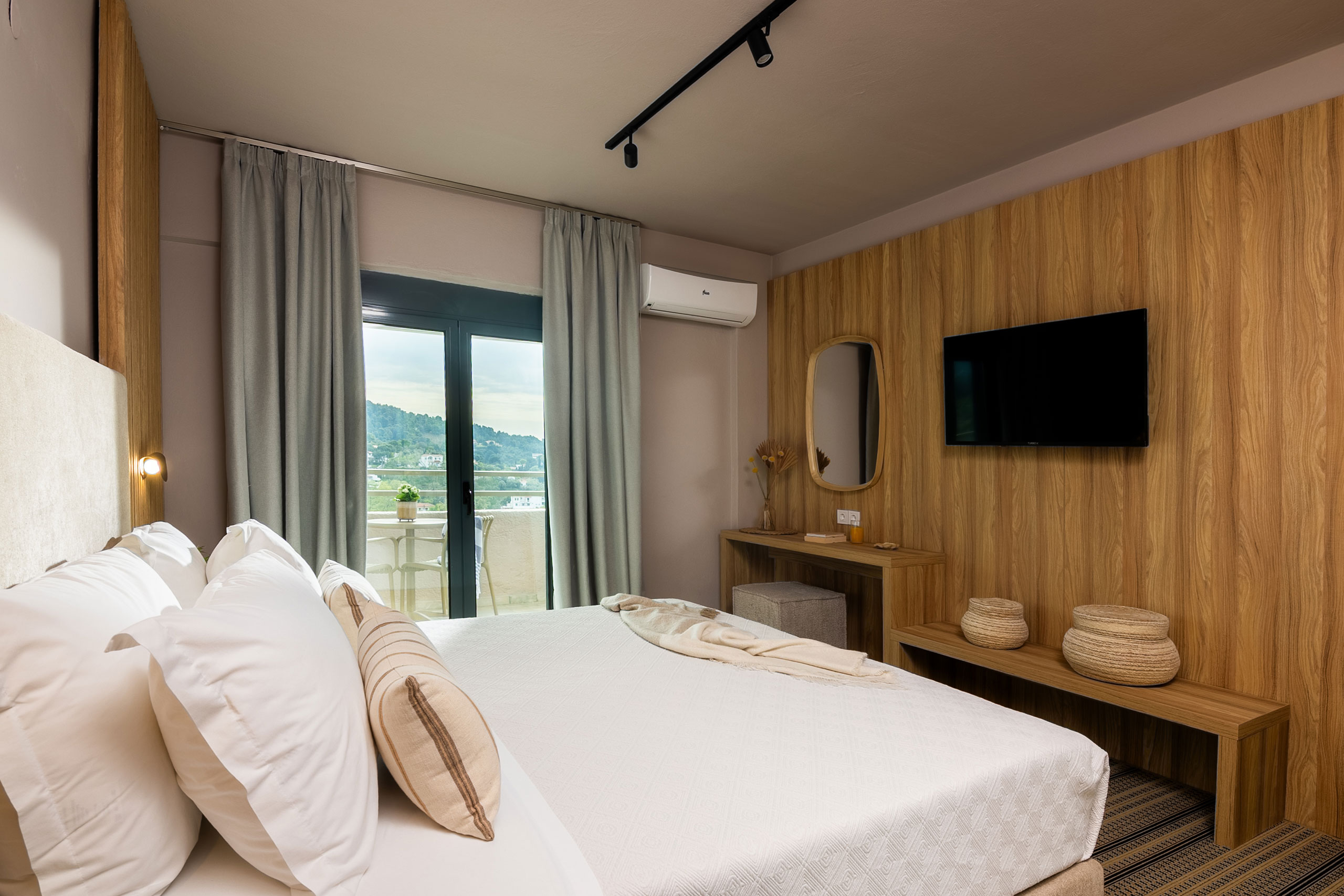 Bask in the charm of the Aegean with a refreshing side sea view. This room offers a blend of comfort and elegance, ideal for a rejuvenating stay. Let the gentle sea breeze sweep away your worries. A peaceful haven with a touch of coastal beauty.